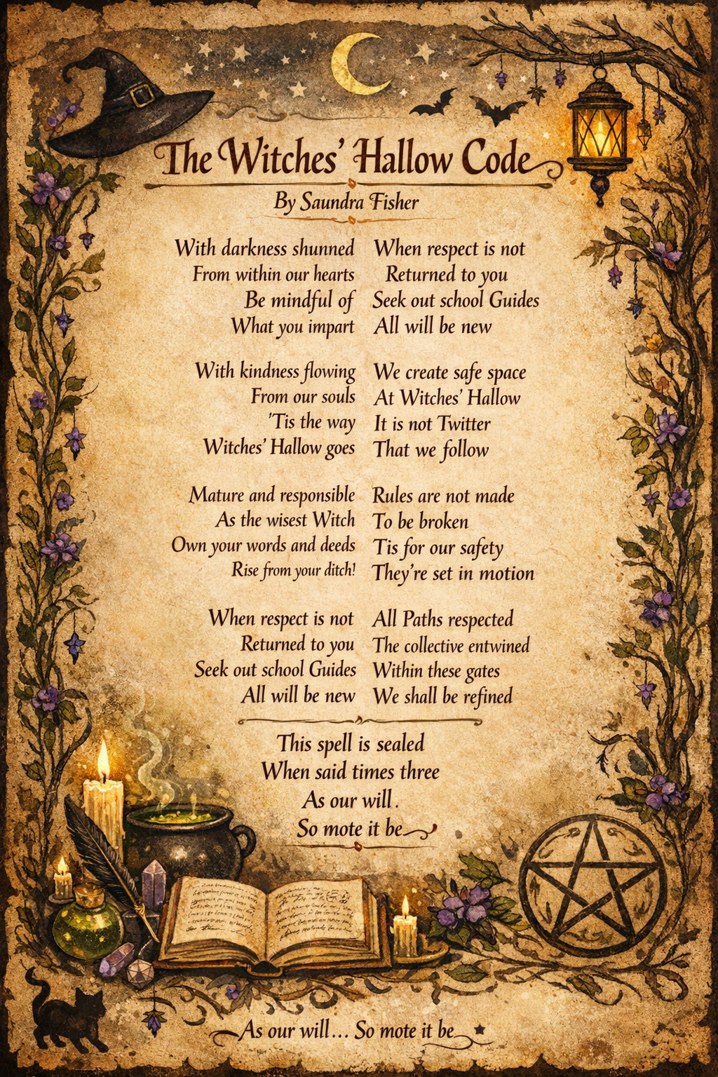 Each stanza weaves together the heart of Witches’ Hallow: kindness over cruelty, accountability over chaos, guidance over isolation, and unity across all spiritual paths. Her words remind us that our Code is not a list of restrictions, but a protective circle—one that keeps our learning spaces safe, welcoming, and magickally aligned.